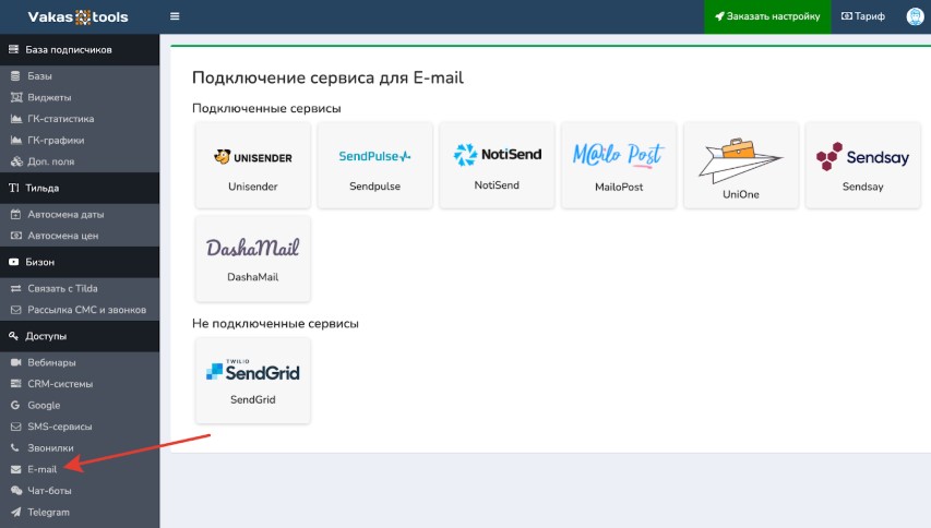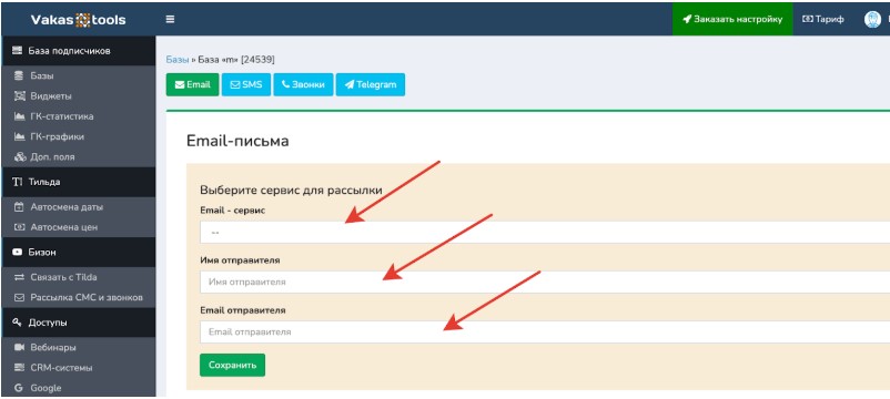 Подключите выбранный сервис (например, UniSender или SendPulse) к Vakas-tools через доступы.