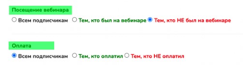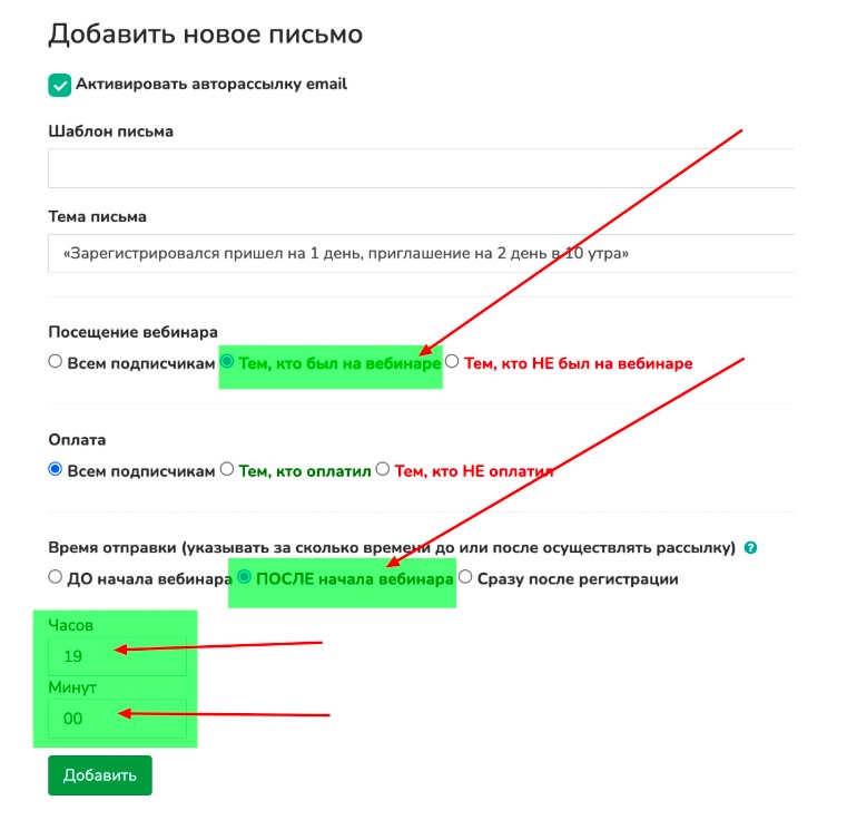 Ольга (не была на первом дне). Настройка для отправки письма участникам, пропустившим первый день - тем кто не был на вебинаре; после начала вебинара; 23 часа 00 минут.