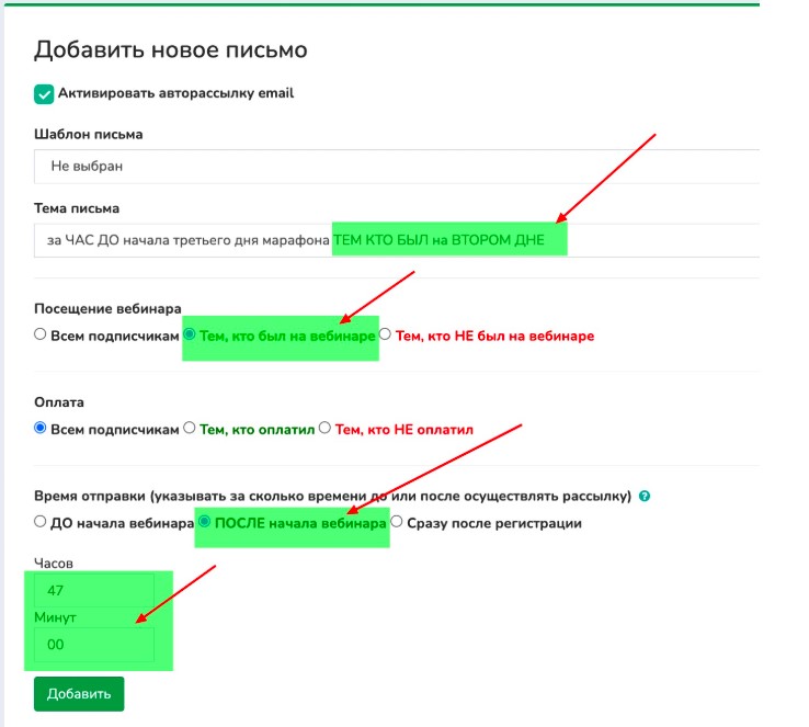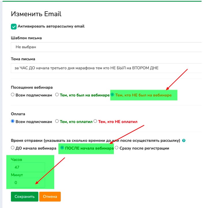 Ольга (не была на втором дне): письмо будет настроено следующим образом: тем кто не был на вебинаре; после начала вебинара; 47 часов 00 минут.