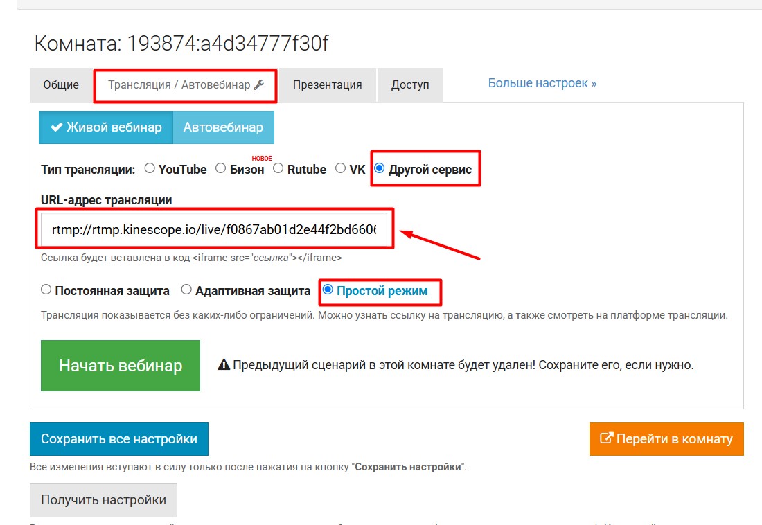 - Настройка Bizon365: зайдите в Bizon365 и перейдите в раздел «Настройки комнаты» → «Трансляция и автовебинар». Вставьте скопированный URL и активируйте режим «Простой», который позволит участникам самостоятельно включать звук.