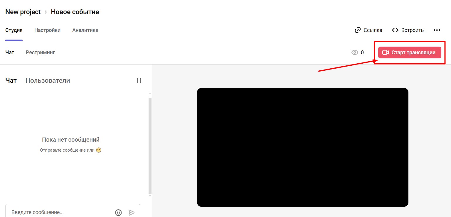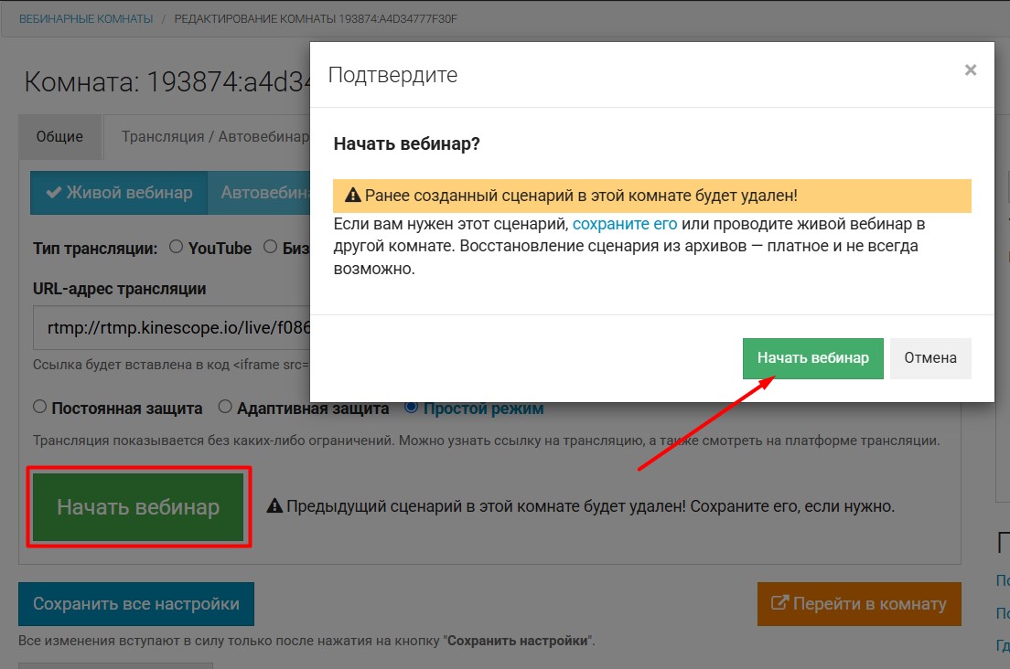 Перейдите в Kinescope, дождитесь автоматизированного запуска и активируйте кнопку «Старт трансляции».