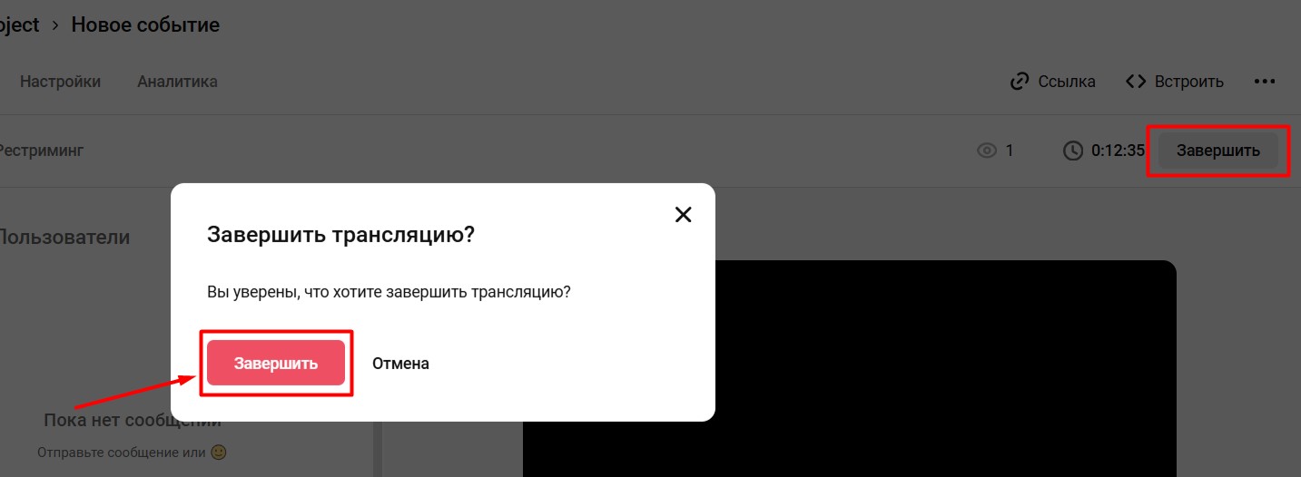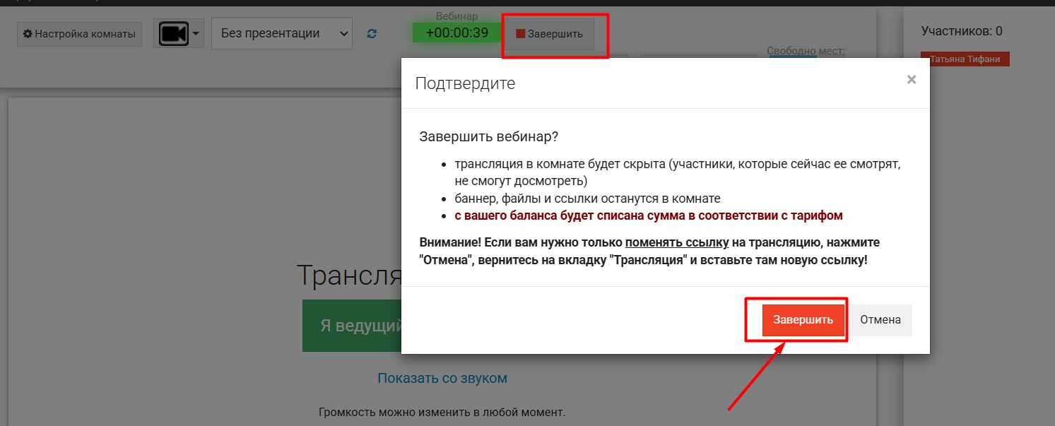 По окончанию вебинара остановите трансляцию в OBS Studio, а также завершите эфир в Kinescope и Bizon365.