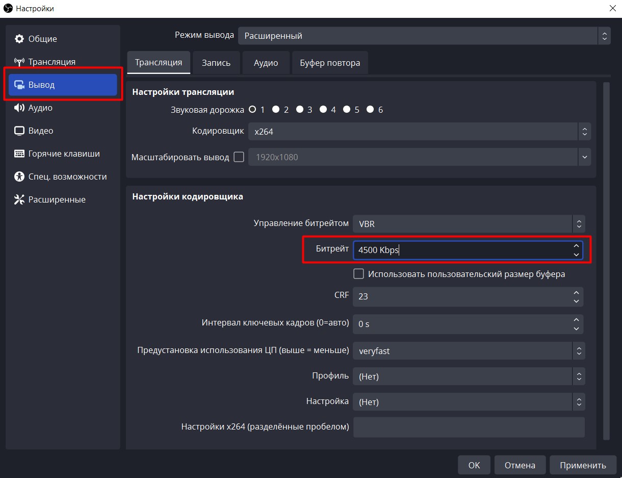 - Подтвердите настройки, нажав «Применить» и «ОК». При необходимости, настройте битрейт в разделе «Вывод» для оптимального качества вещания.