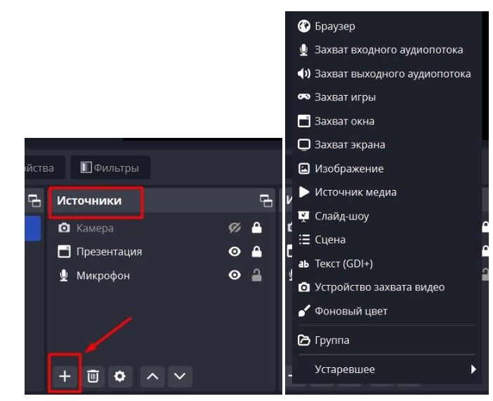 В разделе «Источники» нажмите «+» для подключения необходимых элементов: