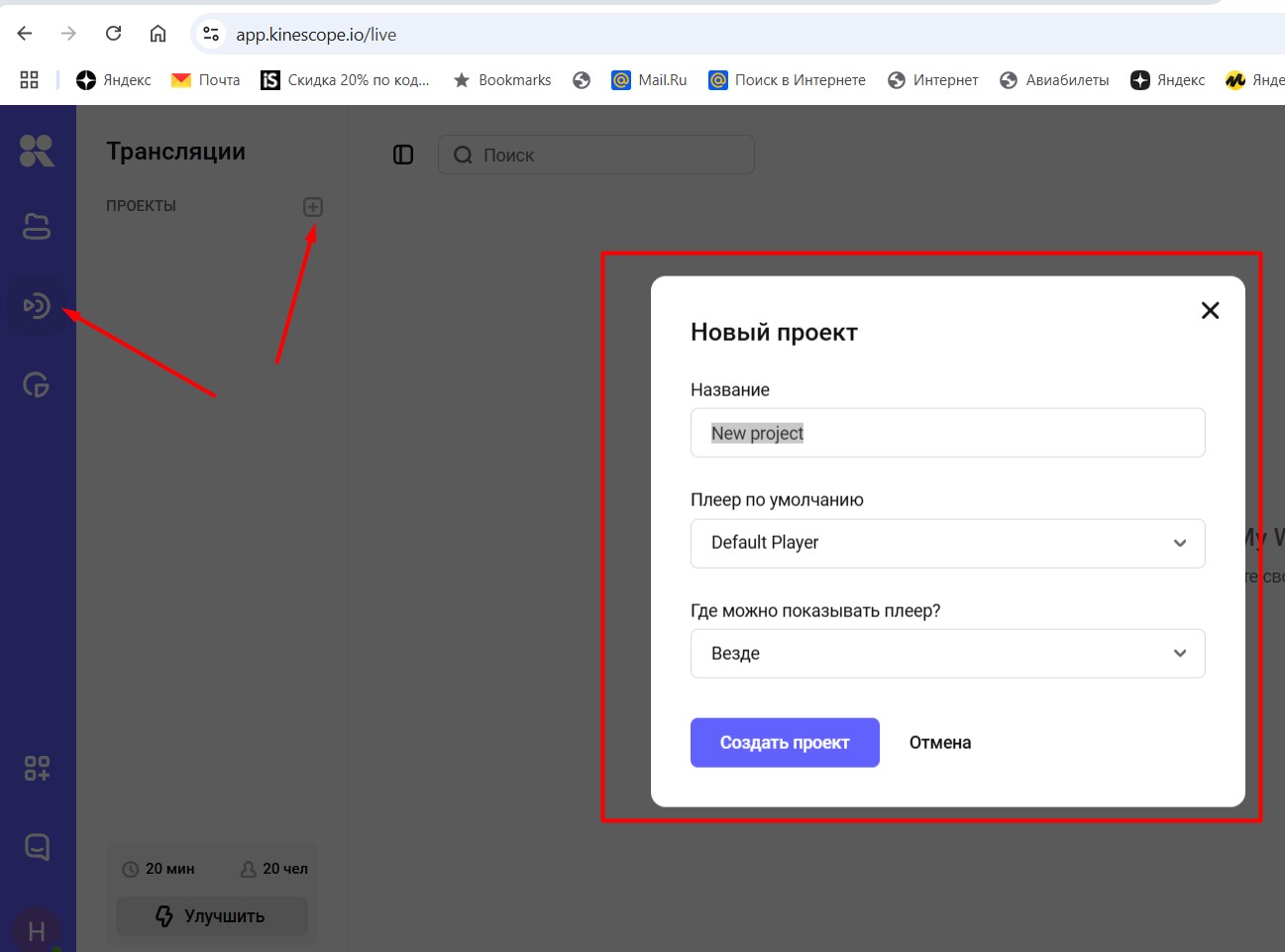 - Создание проекта: в левой панели выберите раздел «Трансляции», затем «Проекты» и кликните «Создать новый проект».