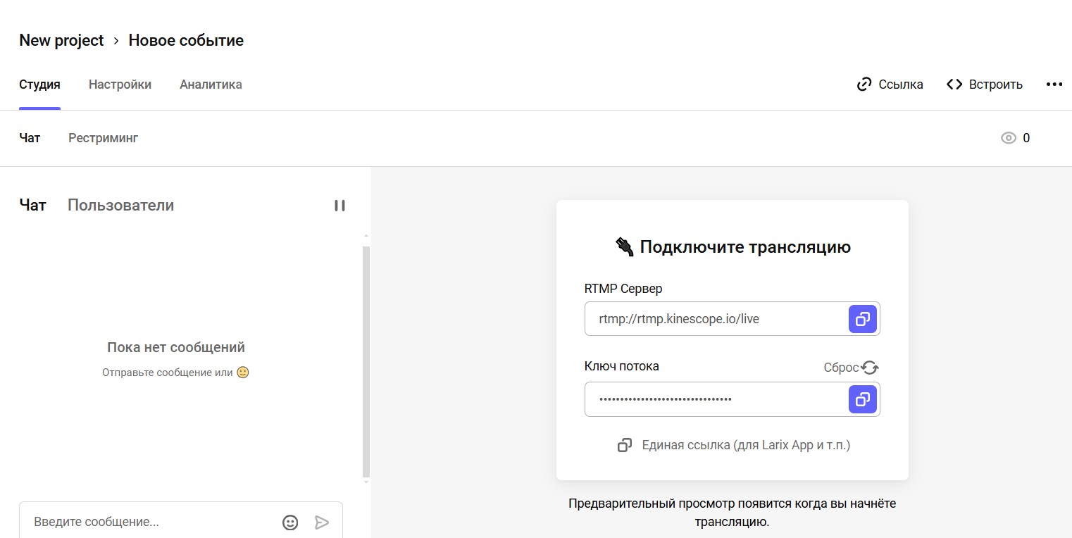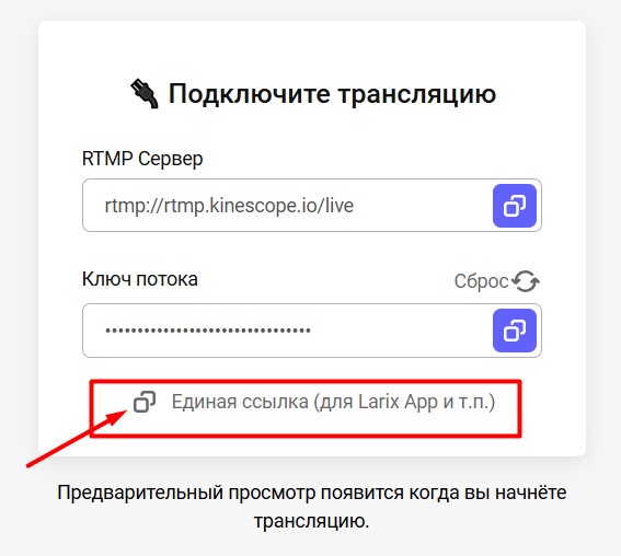 - Получение URL трансляции: скопируйте адрес трансляции из Kinescope.