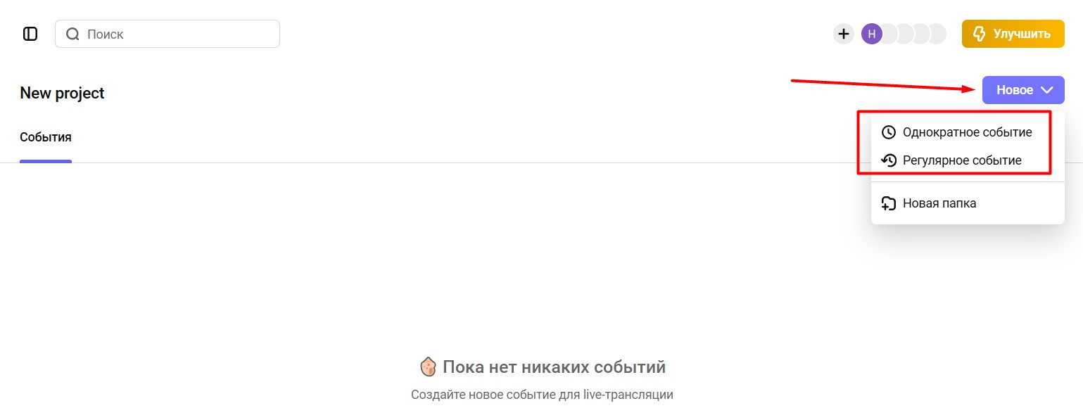 Задайте проекту имя и выберите тип мероприятия:- Однократное событие: каждый эфир получает уникальный веб-адрес.