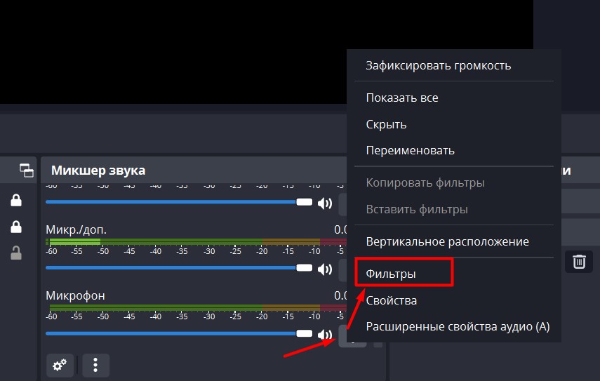 Используйте аудиомикшер для регулировки уровня громкости. Для улучшения качества звука нажмите значок с тремя точками и добавьте фильтры для устранения шумов.