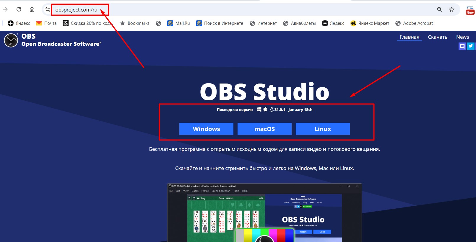 - Зайдите на официальный сайт: откройте браузер и перейдите по ссылке: https://obsproject.com/ru.