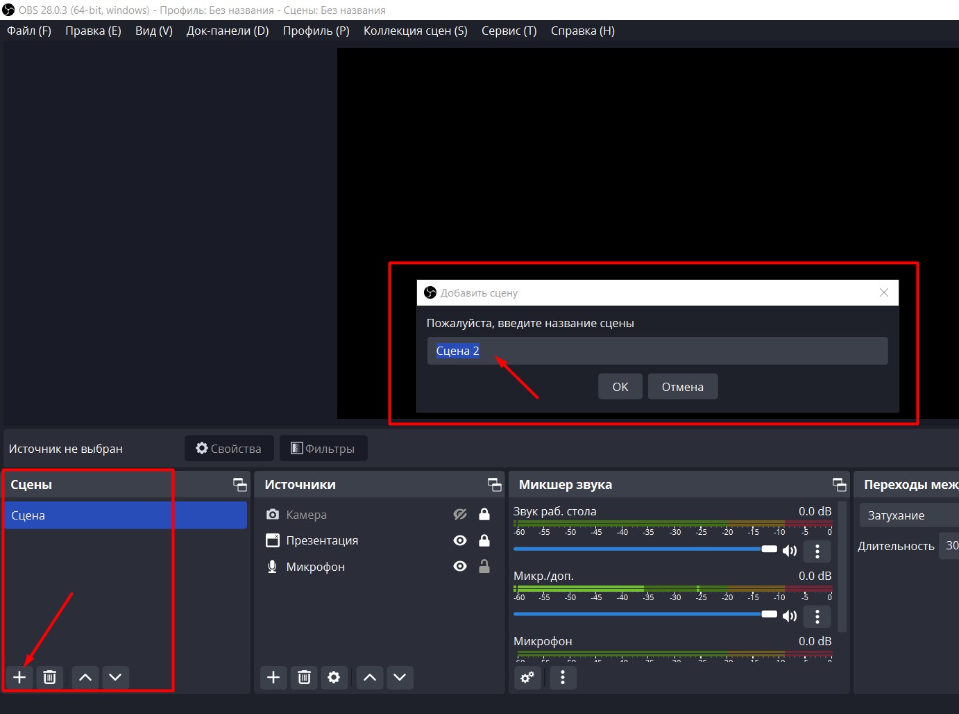 - Добавление сцены: в блоке «Сцены» нажмите кнопку «+». Придумайте лаконичное и понятное название, которое поможет легко ориентироваться в проекте.