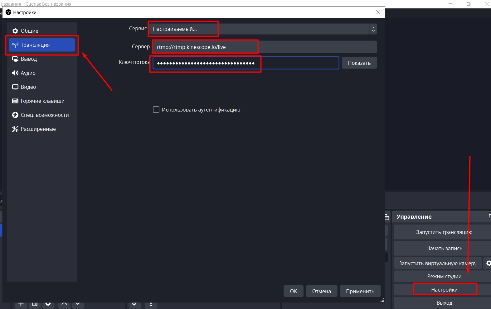 - Настройка трансляции в OBS: в OBS Studio откройте меню «Настройки», затем выберите раздел «Трансляция».